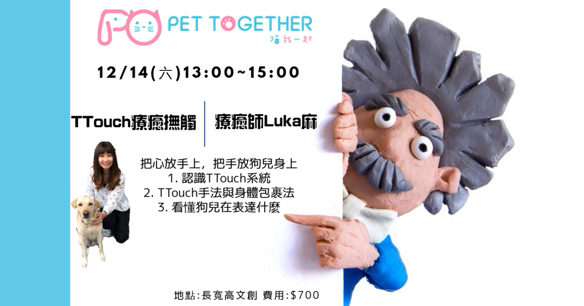 狗兒從幼犬、成犬到高齡犬,在不同階段會面臨不同的身心情況。TTouch 是一套非常特殊的系統,能提供個別時期所需要的協助與支持。只要用我們的心和手,就可以幫助狗兒釋放身體和情緒的壓力,讓牠們擁有好的生活品質。講座中將會介紹許多實用好上手的手法,讓您在家也可以幫狗兒做TTouch。